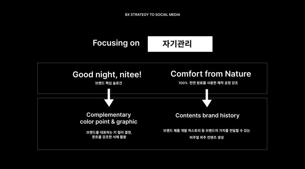 nitee는 수면 시간을 피부와 컨디션을 회복하는 자기관리의 시간으로 정의하고 실크 베개의 촉감과 사용 맥락을 중심으로 브랜드가 추구하는 라이프스타일을 콘텐츠로 전달합니다. 이를 바탕으로 자기관리 루틴을 가진 페르소나의 일상을 반영한 콘텐츠를 통해 소셜 미디어 내 자연스러운 참여와 전환을 유도합니다.