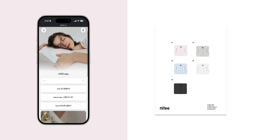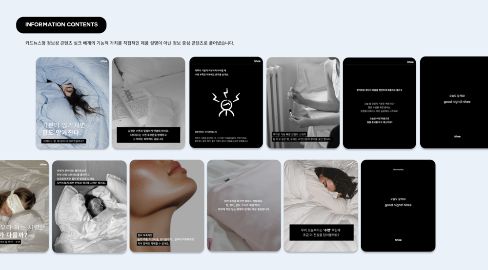 실크 베개 브랜드 nitee의 인스타그램 계정 구축 및 SNS 운영 전반을 담당했습니다. 브랜딩 관점에서 일관된 톤앤매너를 설정하고, 소셜 미디어 전반에 활용 가능한 브랜드 에셋을 기획·제작했습니다