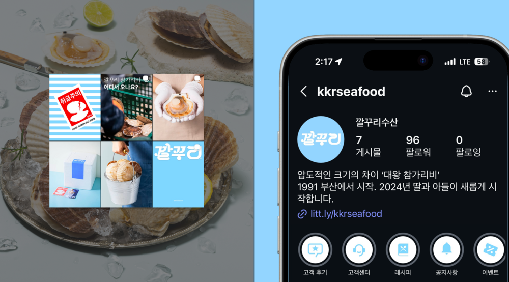 깔꾸리수산은 1991년 부산에서 시작된 가족 기반의 참가리비 전문 수산 브랜드로, 2024년 새로운 세대인 딸과 아들이 브랜드를 재정비하며 온라인 시장에 진입하고 있습니다. 본 프로젝트는 브랜드의 정체성을 시각적으로 재정립하고, 인스타그램을 통해 고객에게 “신뢰·신선·전문성”이 동시에 전달되는 브랜딩 경험을 구축하는 데 목표를 두었습니다.
