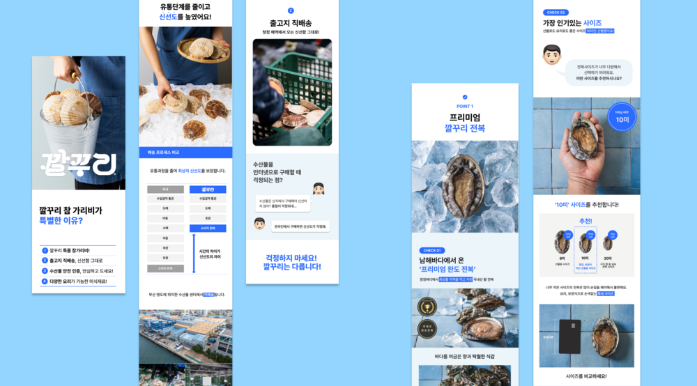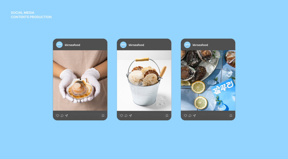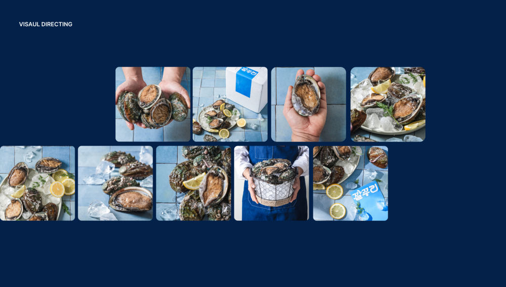 산지와 생산자를 전면에 내세우는 기존 수산물 촬영 방식에서 벗어나 제품 자체의 신선함과 품질이 직관적으로 전달되는 깔끔한 비주얼 이미지를 지향했습니다. 온라인 환경에서도 신뢰감 있게 인식될 수 있는 시각적 기준을 설정했습니다. 이를 통해 깔꾸리수산은 ‘산지를 강조하는 수산물 브랜드’가 아닌, 정돈된 이미지로 품질을 말하는 프리미엄 수산 브랜드로 포지셔닝되도록 촬영 콘셉트와 비주얼 방향을 기획했습니다.